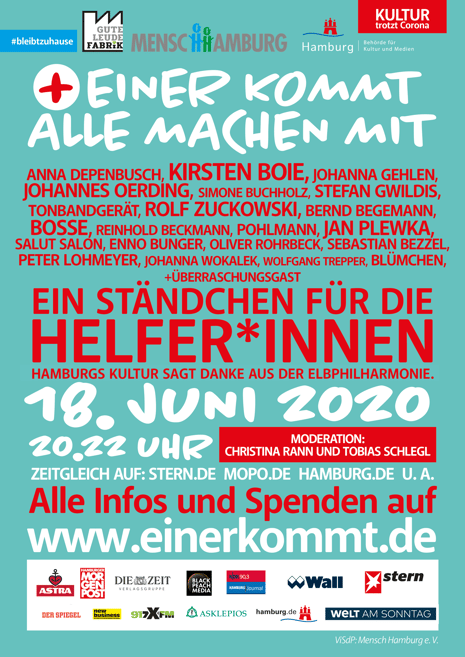 Nach dem Erfolg vom Solidaritäts-Nicht-Festival #KeinerKommt bedankt sich Hamburgs Kultur nun mit einer einzigartigen, bunten Streaming-Live-Show bei den Heldinnen und Helden der Krise und unterstützt somit