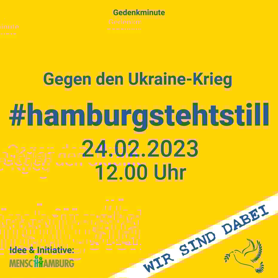 Am Montag, den 24. Februar jährt sich der Kriegsbeginn in der Ukraine zum dritten Mal. Unter dem Motto #HamburgStehtStill ruft der Verein MenscHHamburg alle Hamburgerinnen und Hamburger erneut zu einer ortsunabhängigen Gedenkminute am Montag, den 24. Februar, um 12:00 Uhr auf. Auch in diesem Jahr beteiligen sich zahlreiche Institutionen, Unternehmen und Hamburger und Hamburgerinnen auf vielfältige Weise.